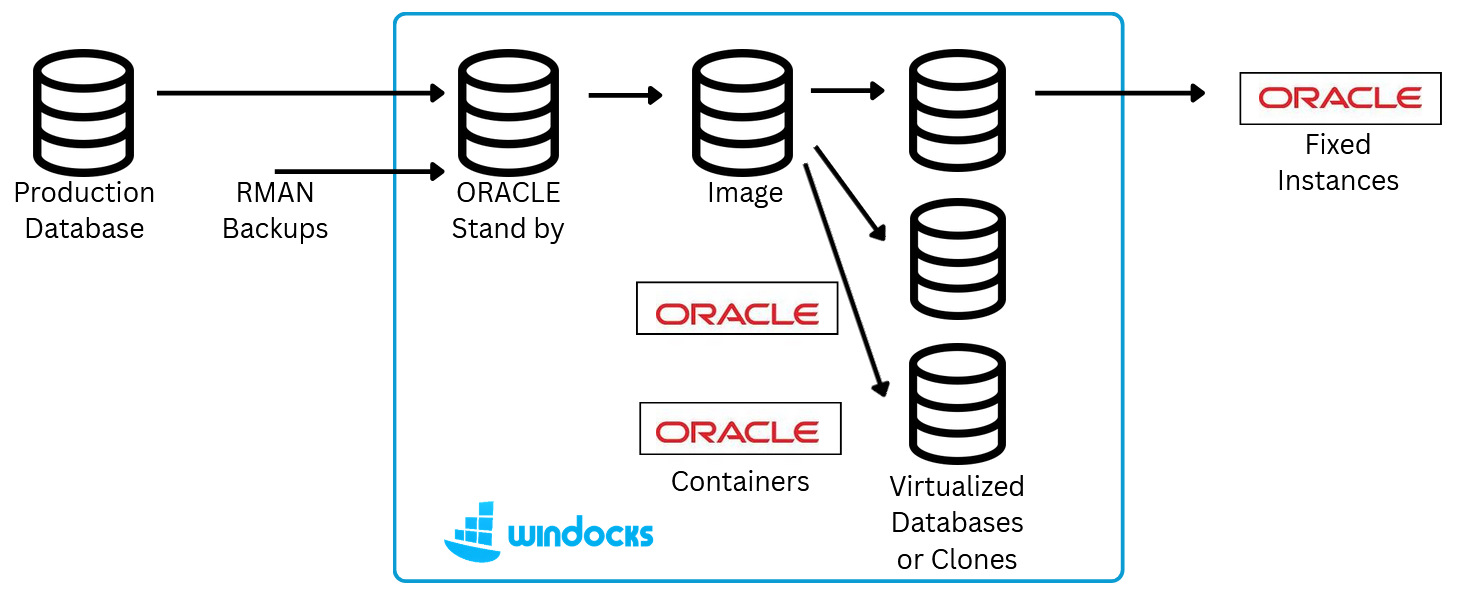 - Virtualized databases are delivered to local Docker Oracle containers, or to fixed Oracle instances